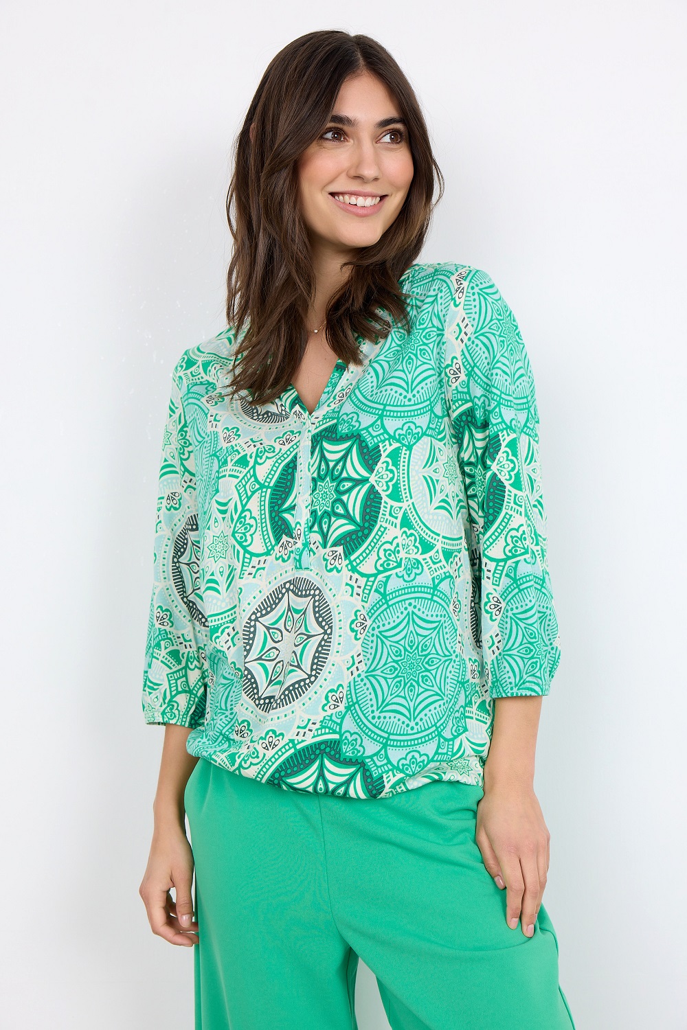 SC-Felicity AOP 418 is a feminine blouse in a nice blend of organic cotton and viscose. The blouse has a v-neckline, a placket closure, 3/4 sleeves and a vibrant print. Style this blouse tucked into a pair of linen shorts for a breezy look.