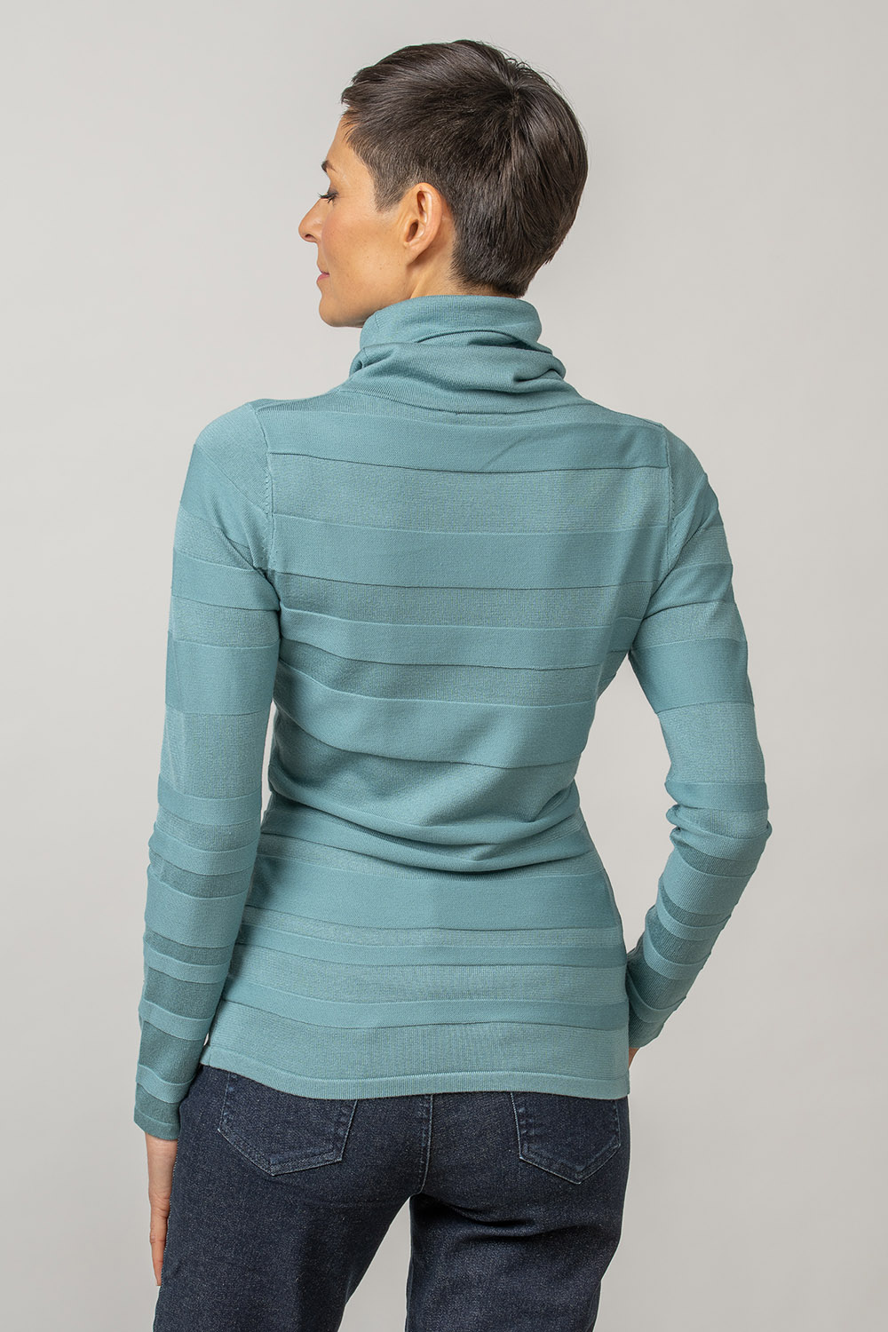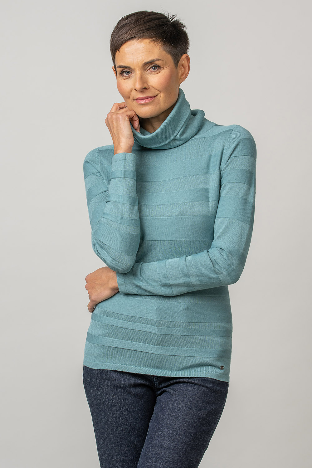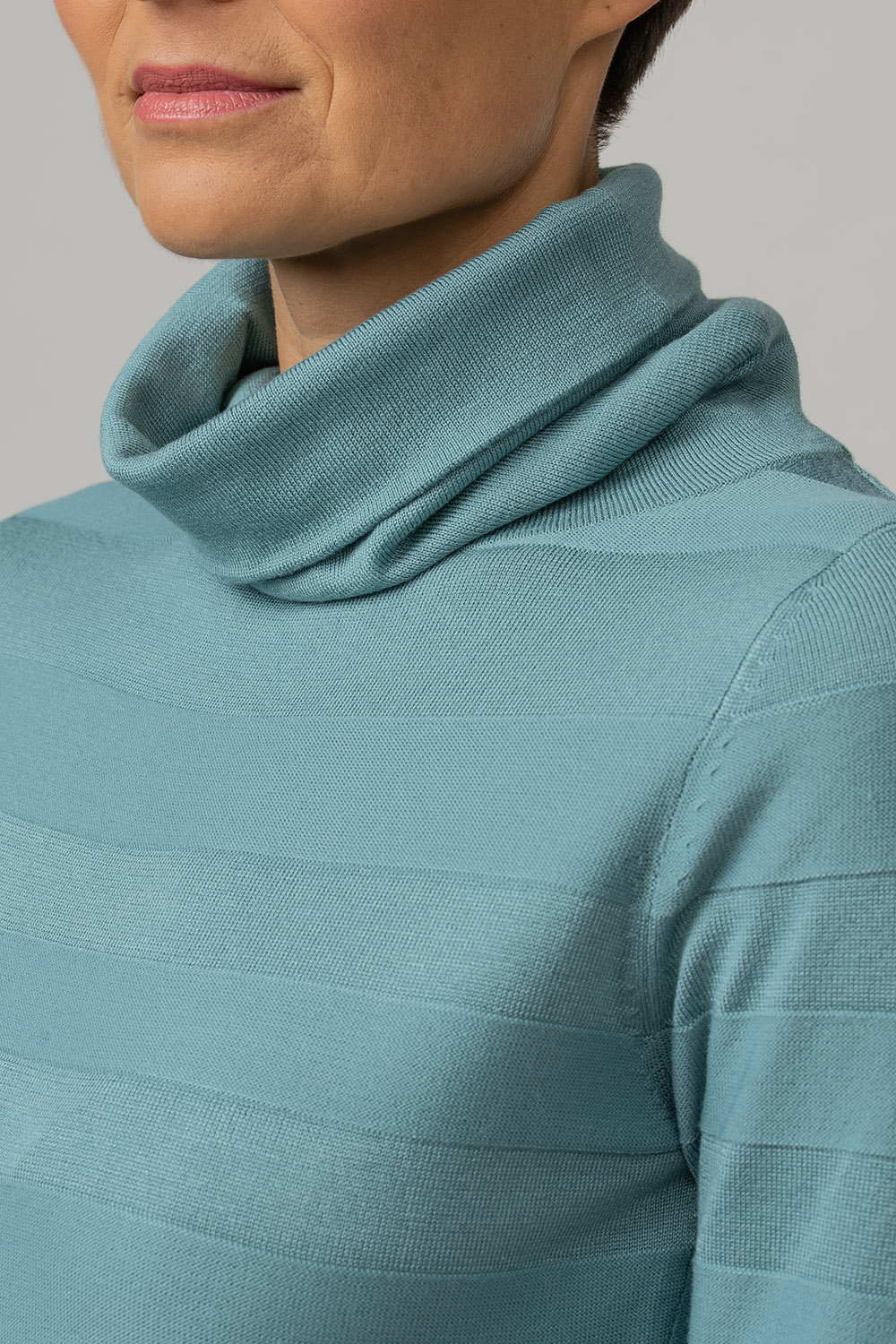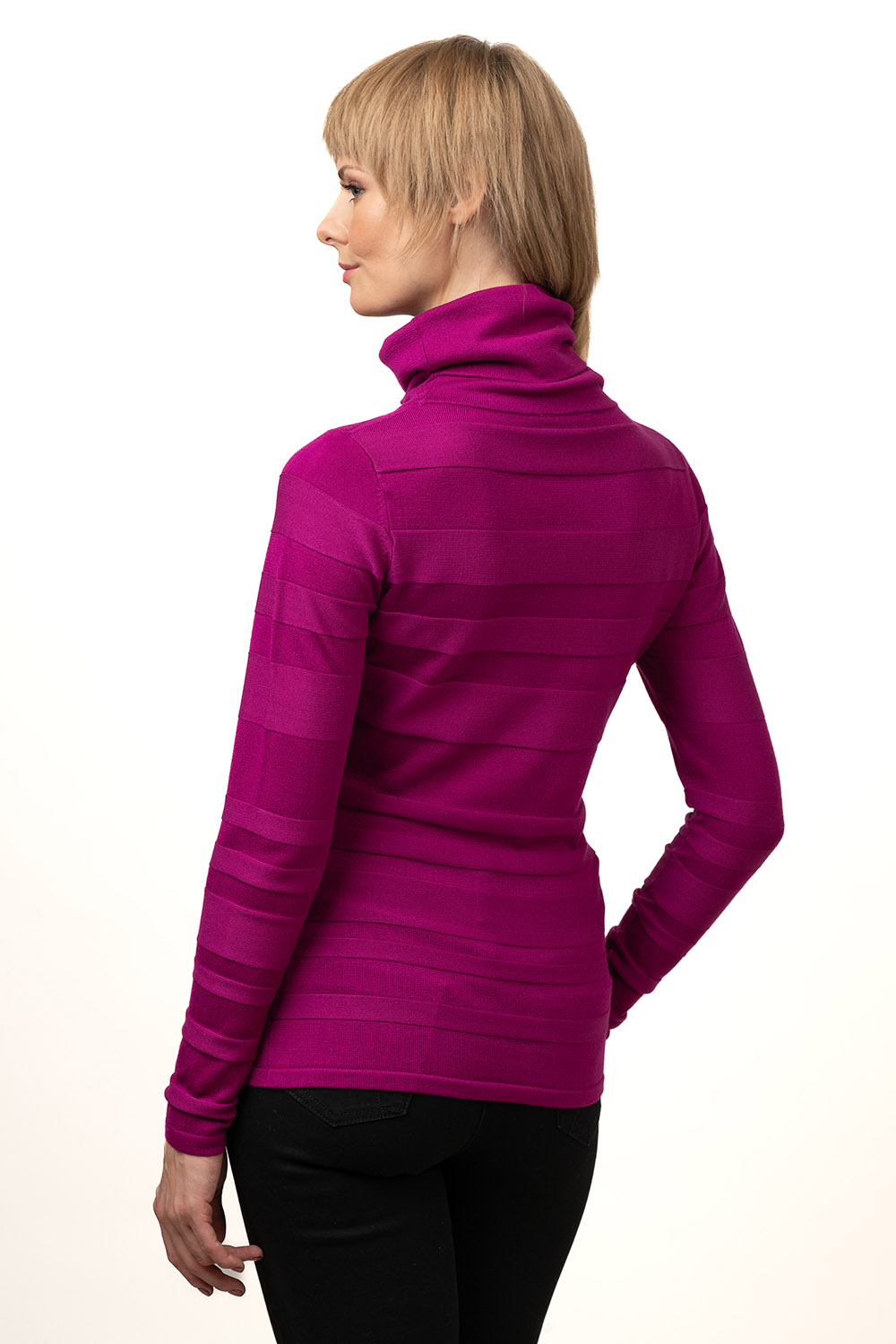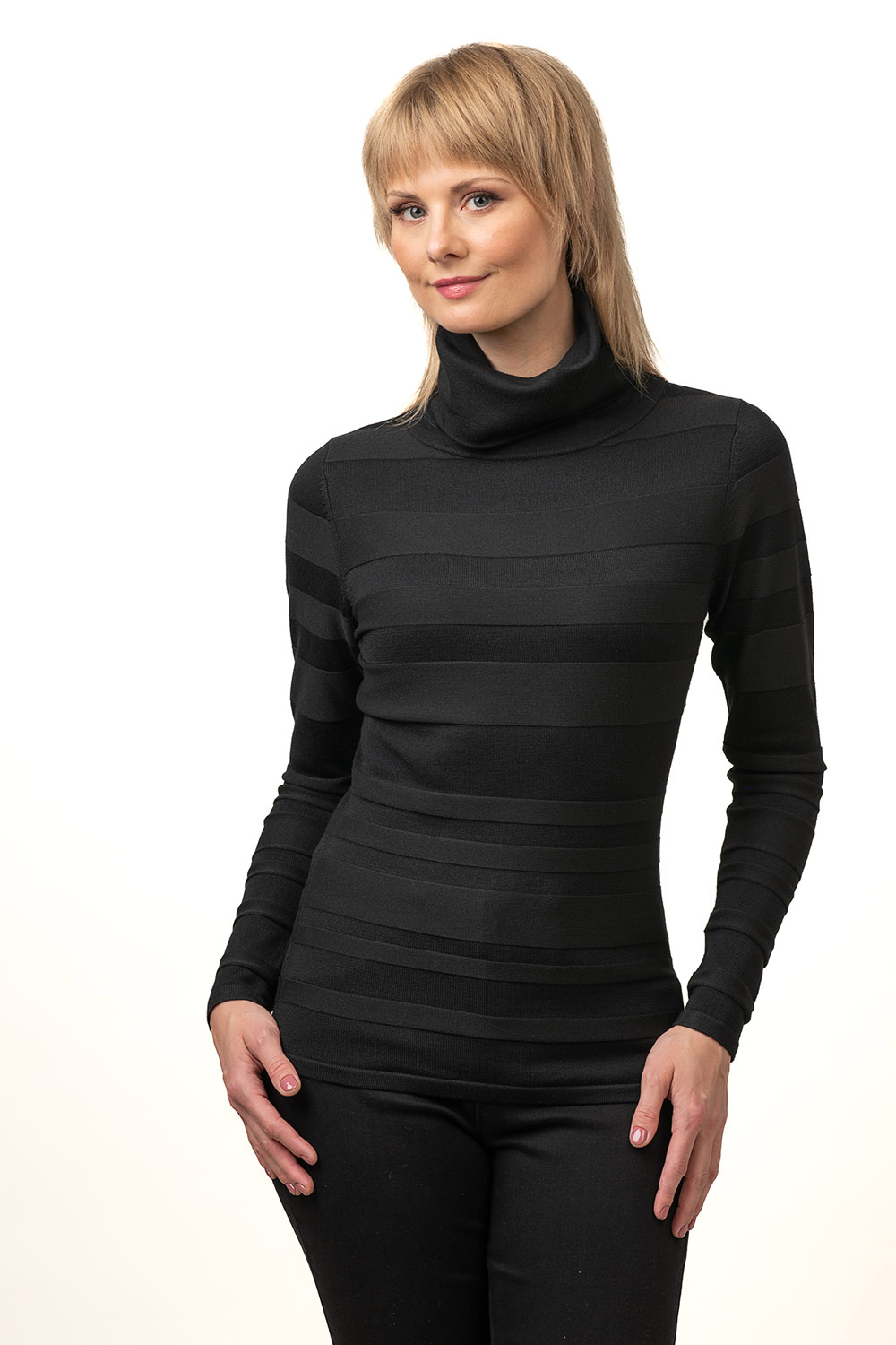 A structurally woven stripe pattern has been used in the design of the jumper Iria. The product has a free-falling turtleneck and a classic fit. Viscose blend yarn makes the product pleasantly soft and skin-friendly.