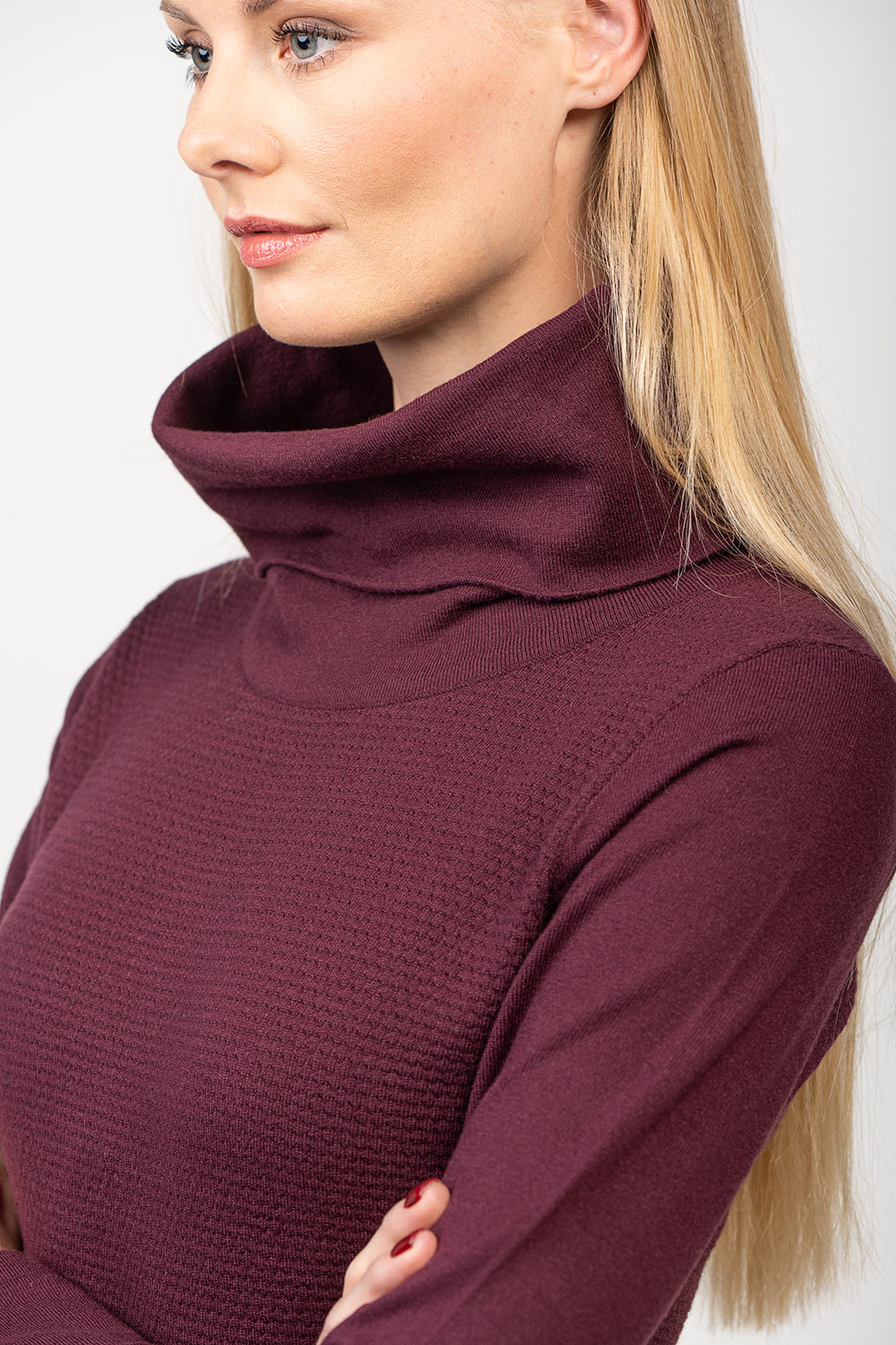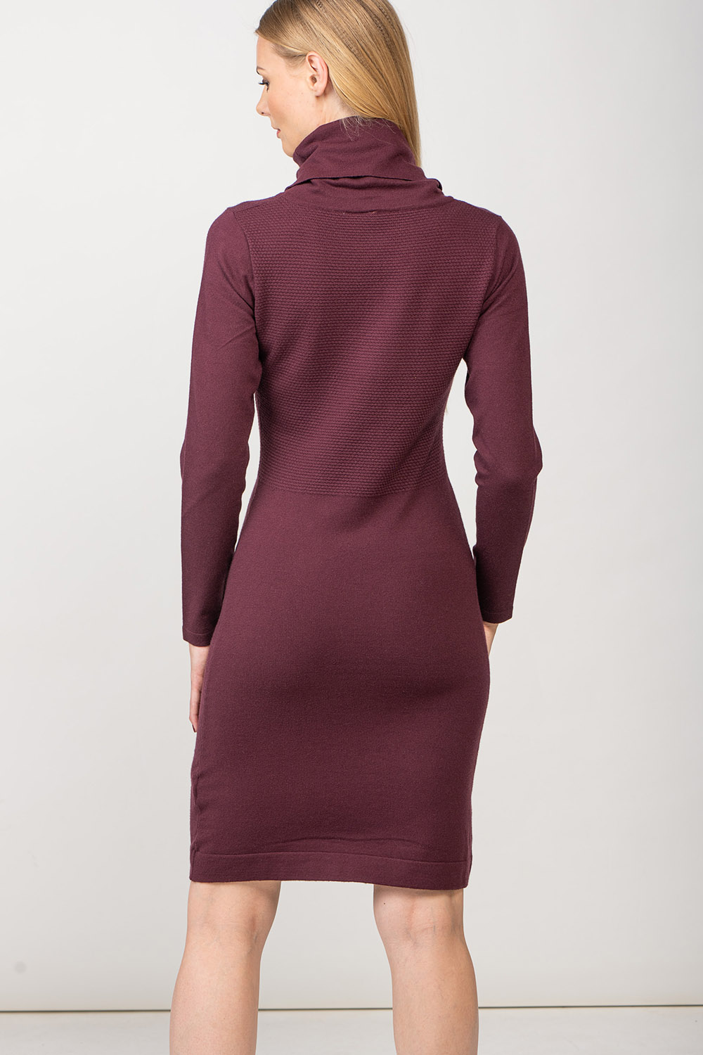 Style Cathy is a knitted dress made of skin-friendly soft yarn. The product has a wide falling roll collar and a structurally knitted body part. A truly comfortable yet elegant choice.