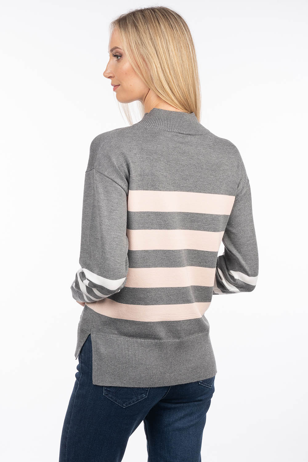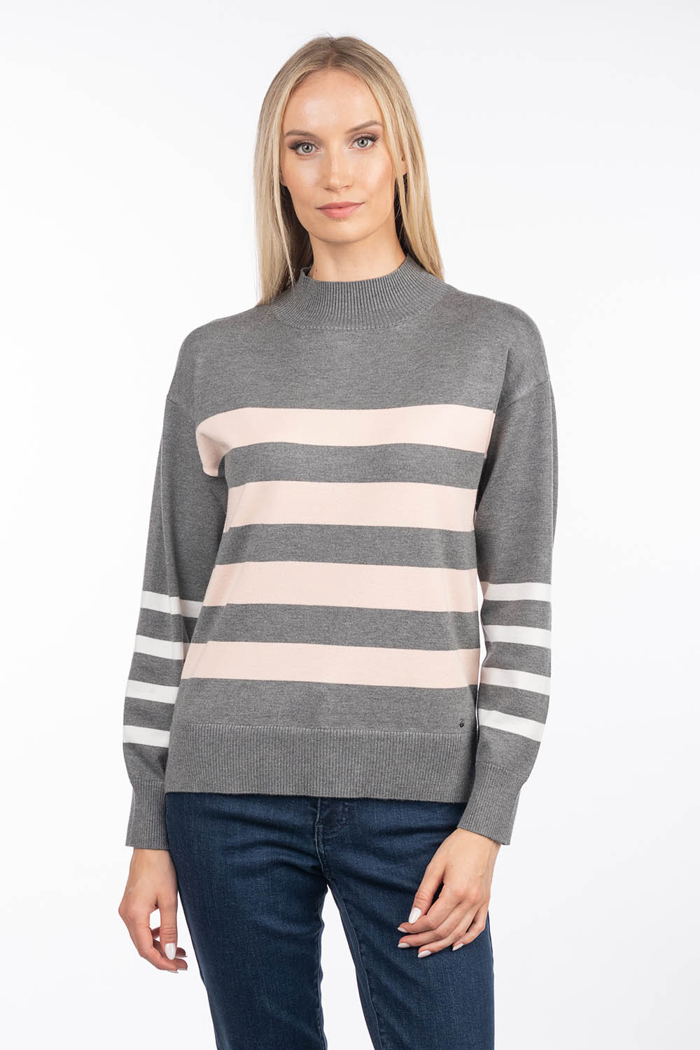 The model Wafa1 is a stylish sweater with stripes in contrasting colors. The product has a loose fit, slits on the sides, the back has an extended cut. An ideal addition to a wardrobe that can be used in any season.