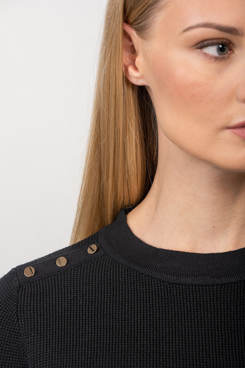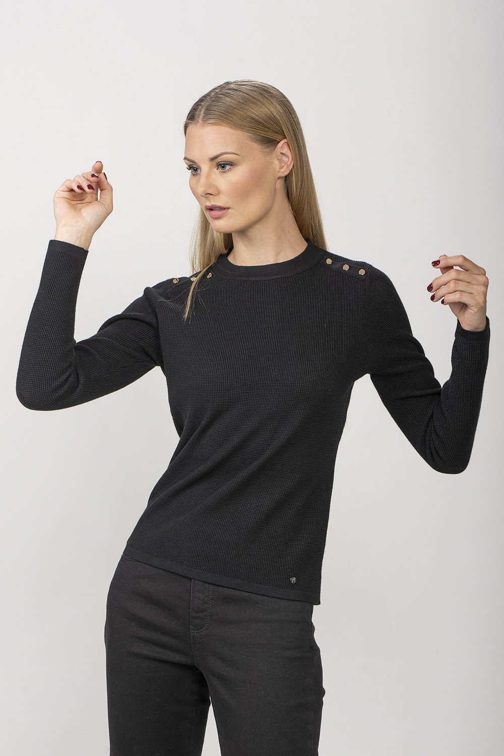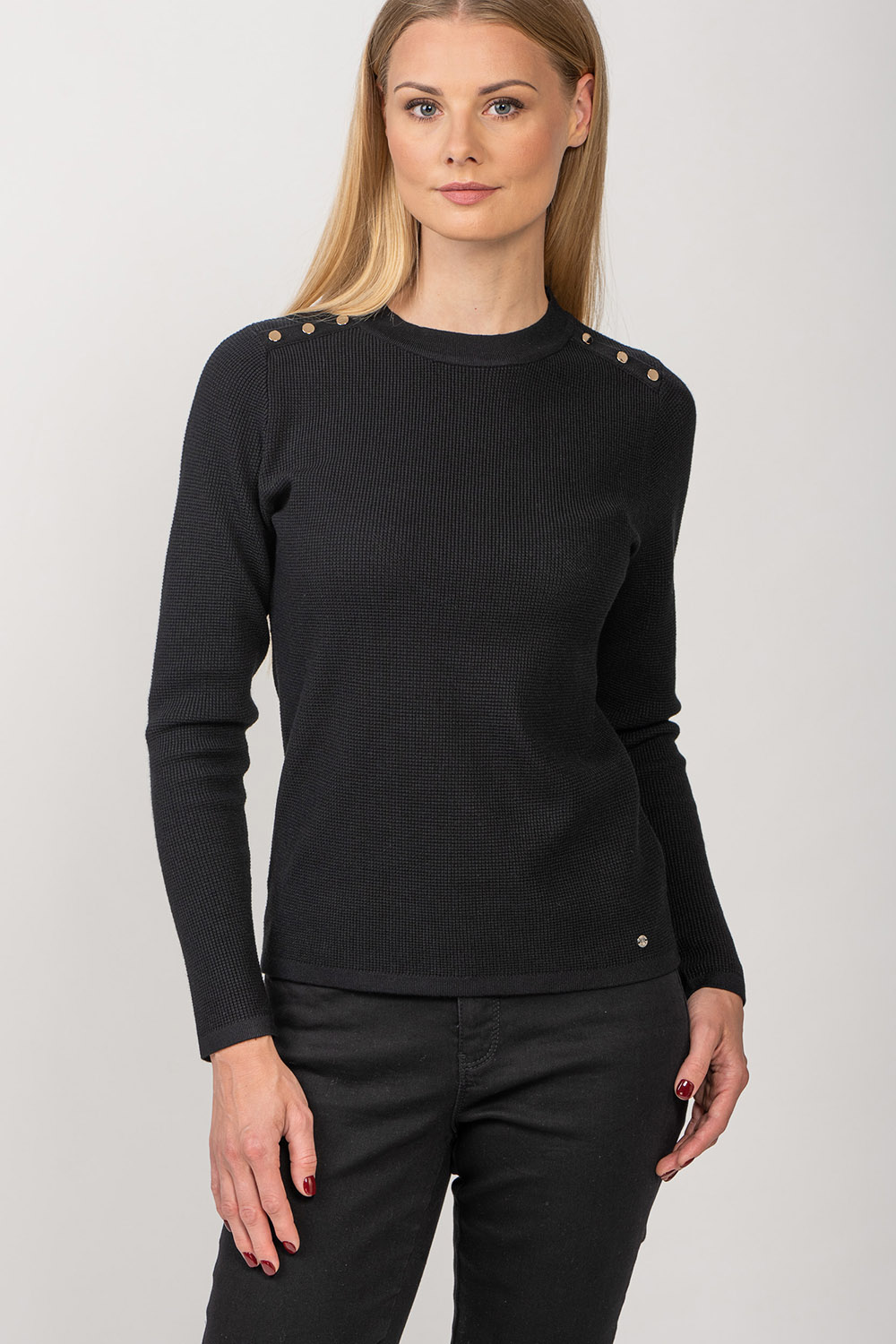 This jumper is knitted with playful structure and decorated with gold-tone buttons. Viscose blend yarn makes the product pleasantly soft and skin-friendly.