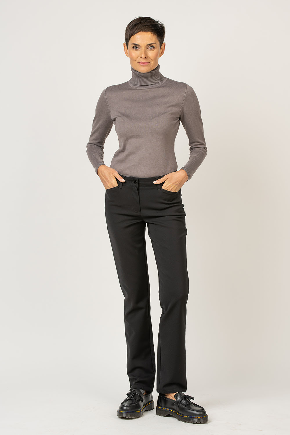 These black straight cut trousers are a basic that belong in every wardrobe. Pair them with a blazer in for a classic look or with a fashionable knit piece for a casual look.
