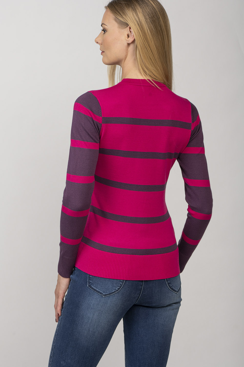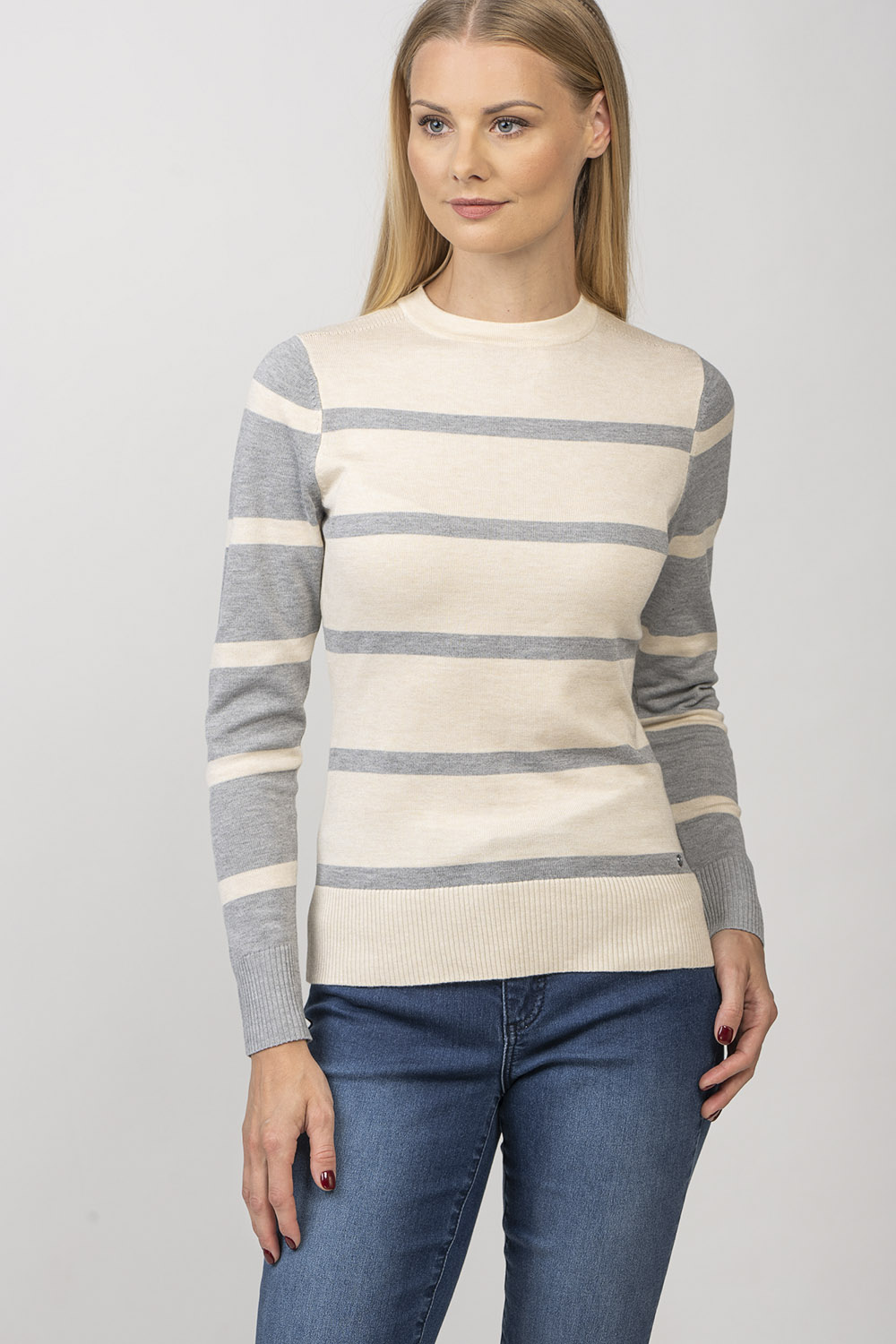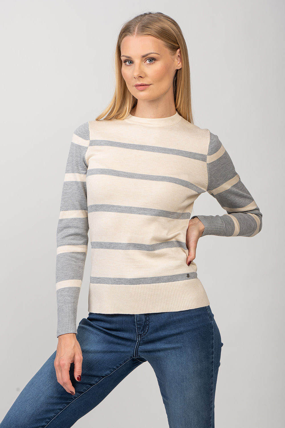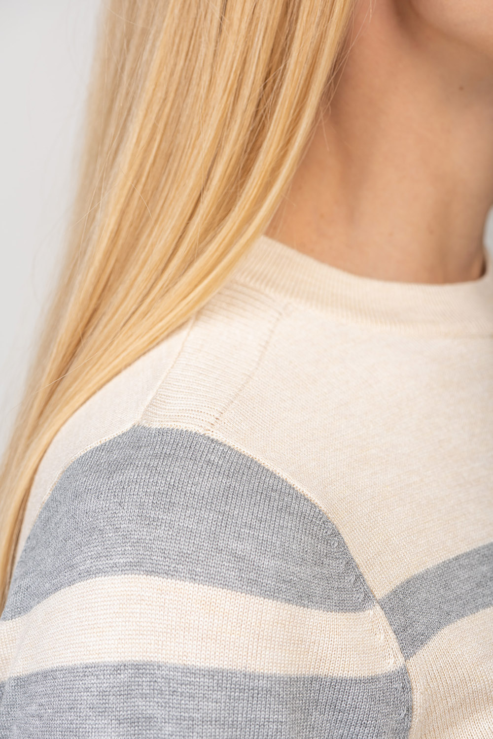 Ariana — свитер с круглым вырезом в игривую полоску. Линия плеча изделия имеет ребристую деталь. Пряжа из смесовой вискозы делает изделие приятно мягким и приятным для кожи.