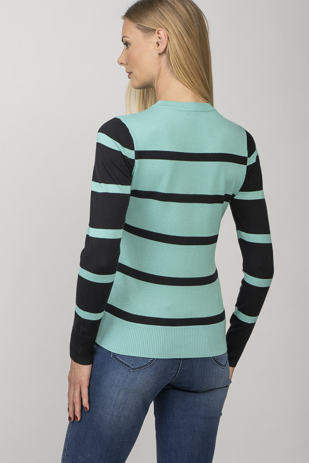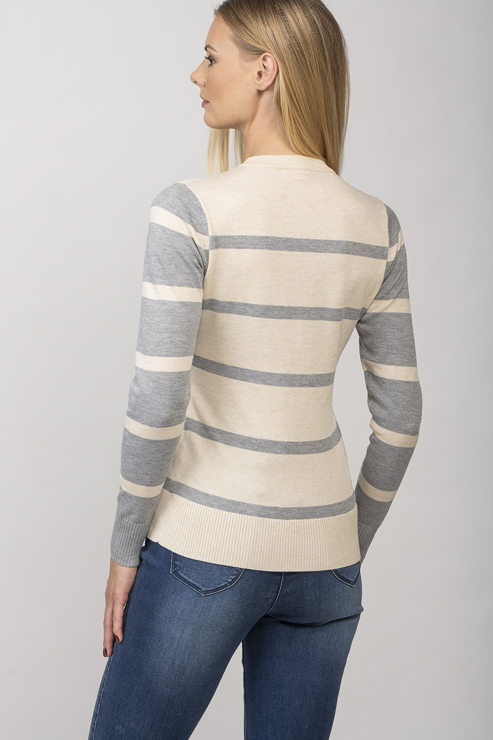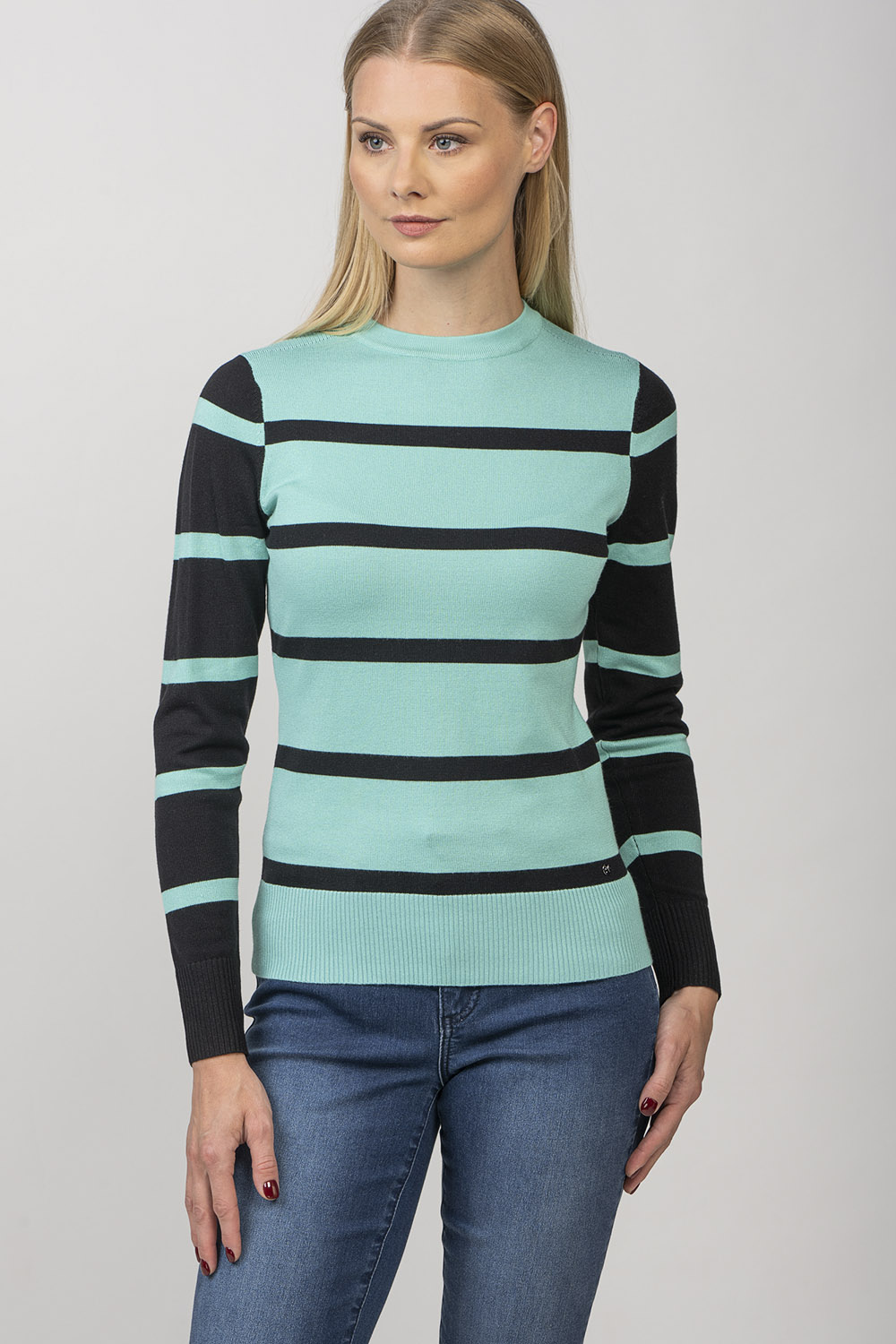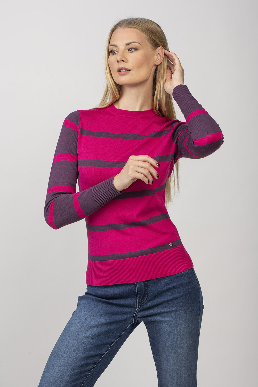 Ariana — свитер с круглым вырезом в игривую полоску. Линия плеча изделия имеет ребристую деталь. Пряжа из смесовой вискозы делает изделие приятно мягким и приятным для кожи.
