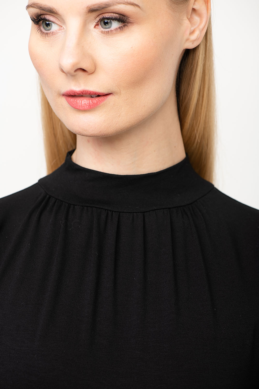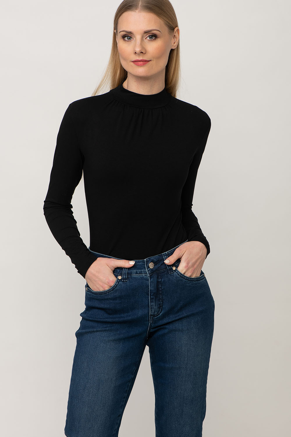 Hanna — рубашка с высоким воротом, сделанная из приятной для кожи ткани из вискозы. Под вырезом — игривая декоративная деталь. Обязательная рубашка в любом гардеробе.