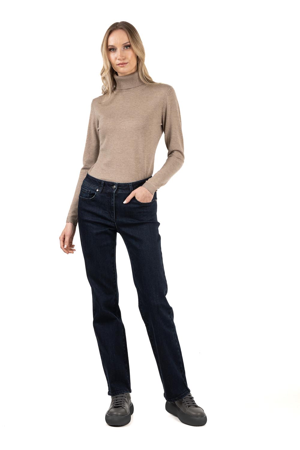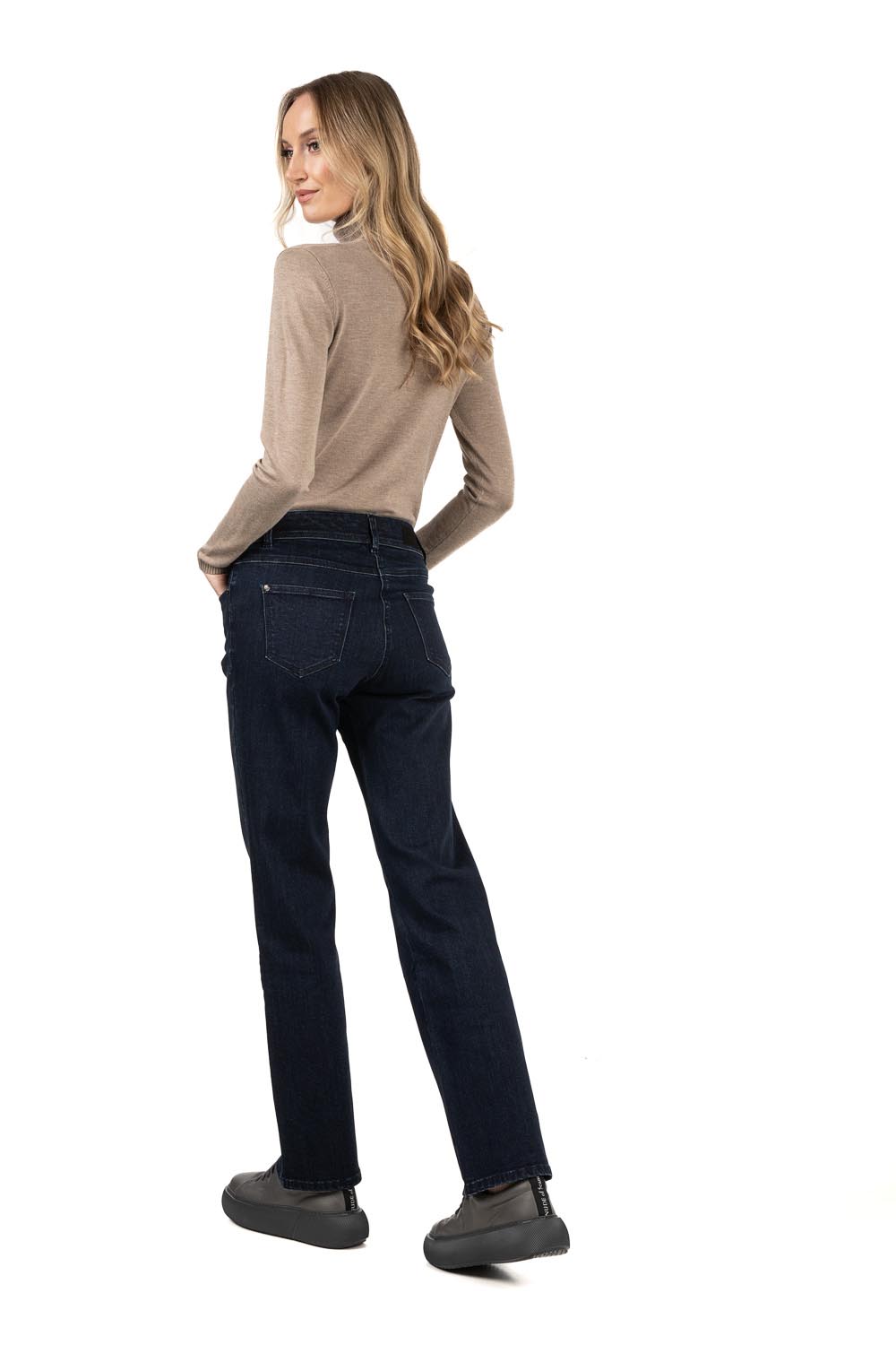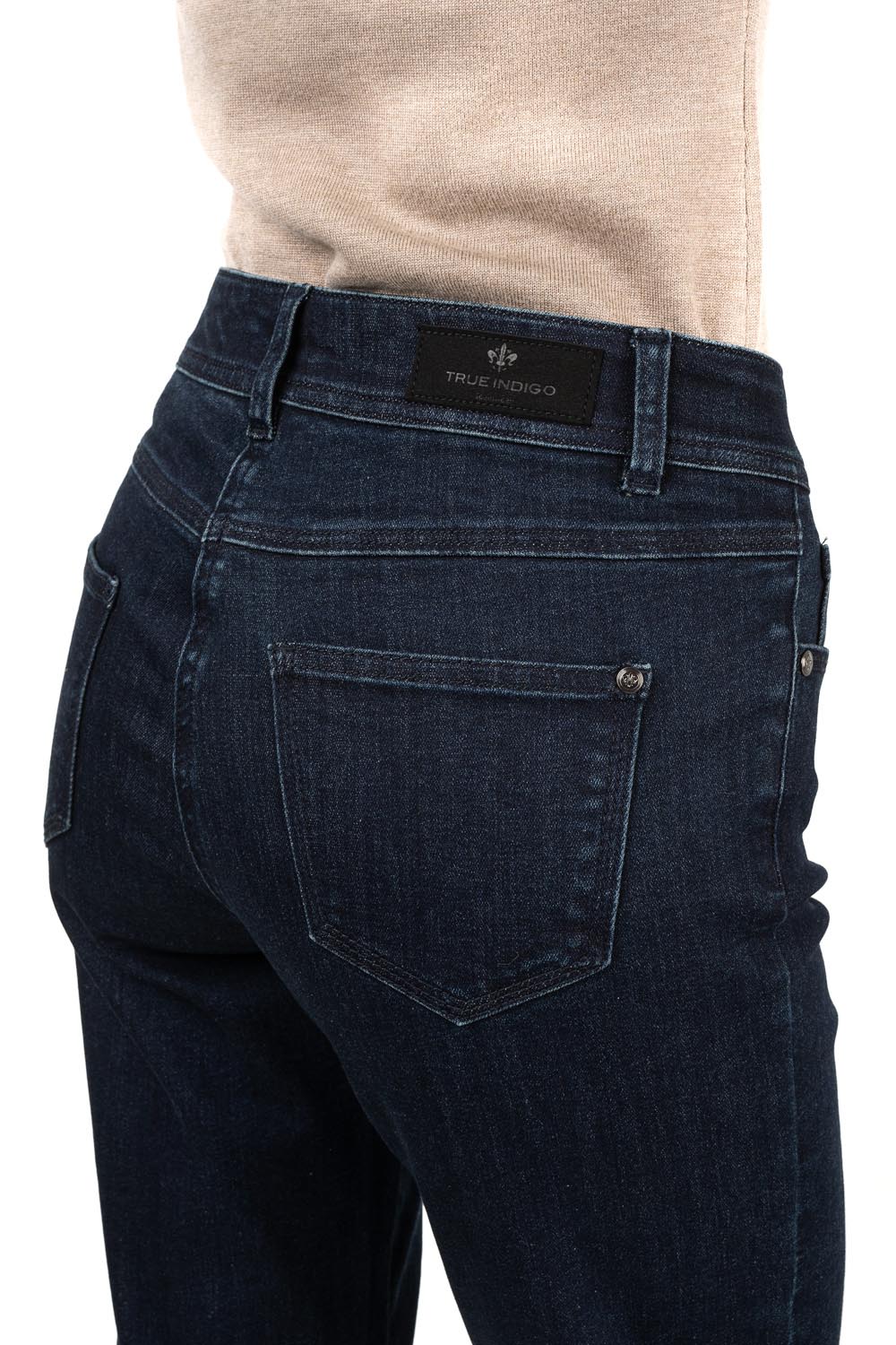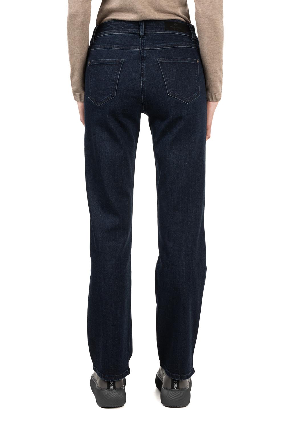 Эти классические темно-синие эластичные джинсы — настоящие фавориты гардероба. Расклешенный крой и средняя посадка создают красивый, сбалансированный силуэт. Благодаря мягкой и эластичной ткани эти брюки обеспечивают первоклассный комфорт на весь день, идеально подходя как для офиса, так и для отдыха.