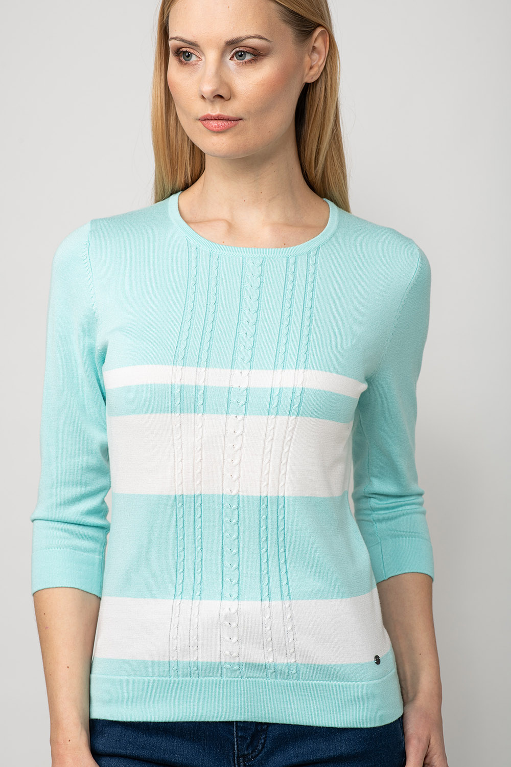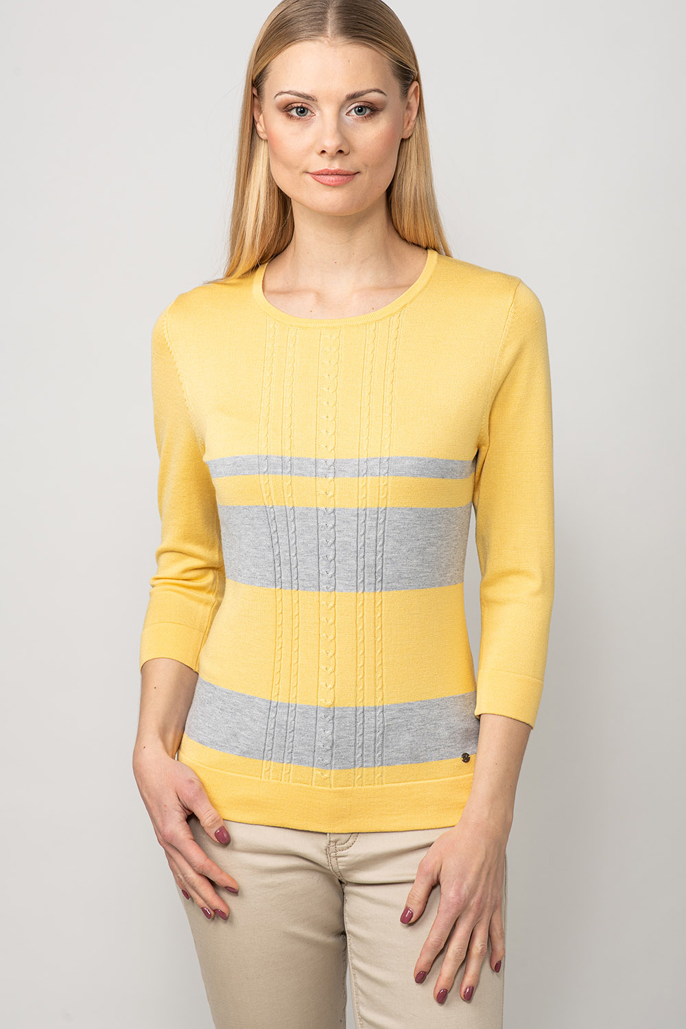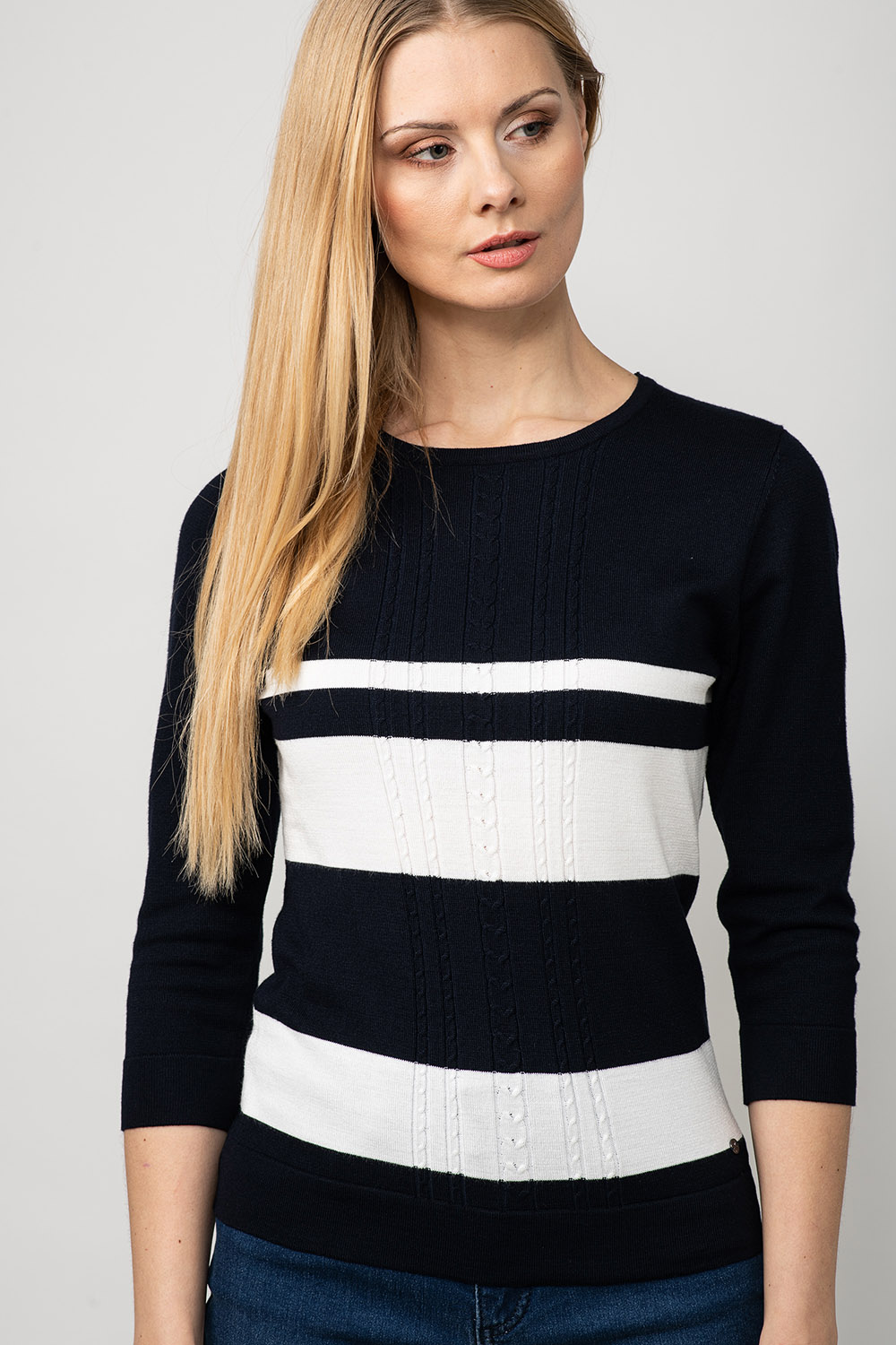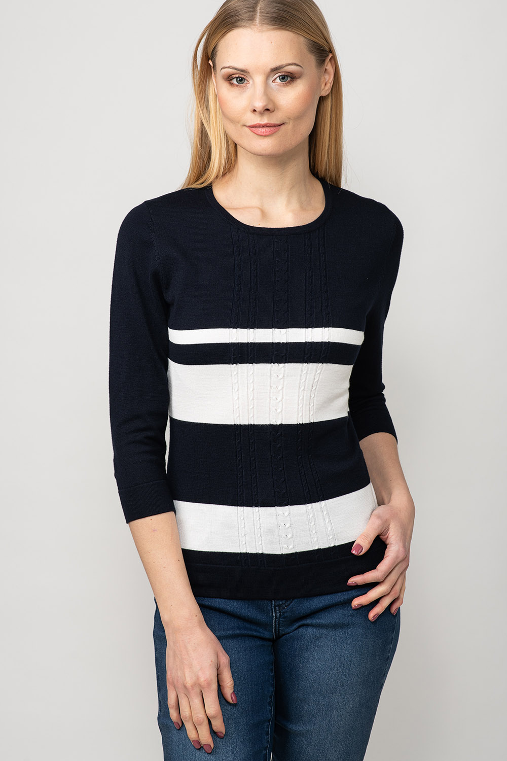 Värviline ja mugav! Džempri disainis on kasutatud laiu kontrast-triipe ja palmikustruktuuri toote rinnaosal. Lõnga peamiseks koostisosaks on viskoos, mis teeb toote meeldivalt pehmeks ja nahasõbralikuks.
