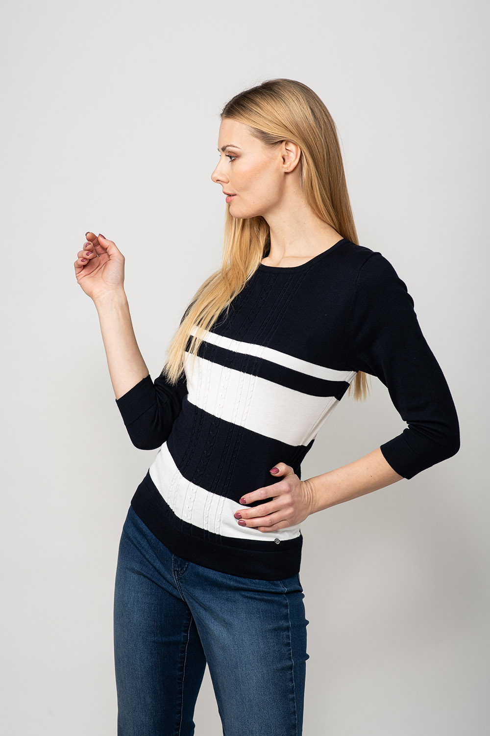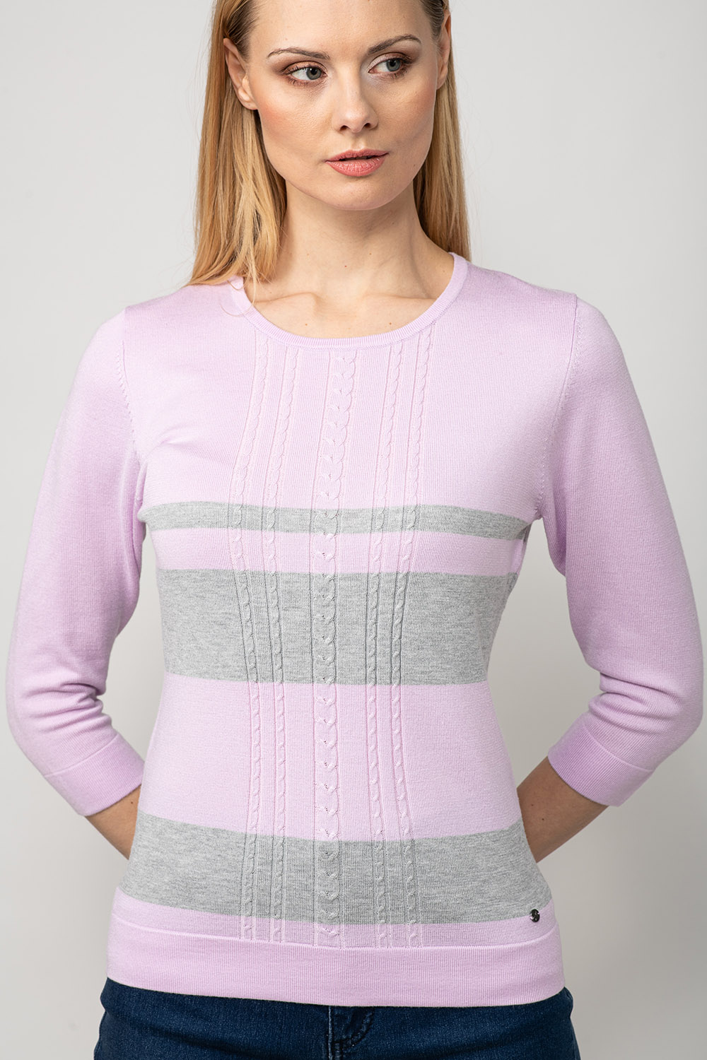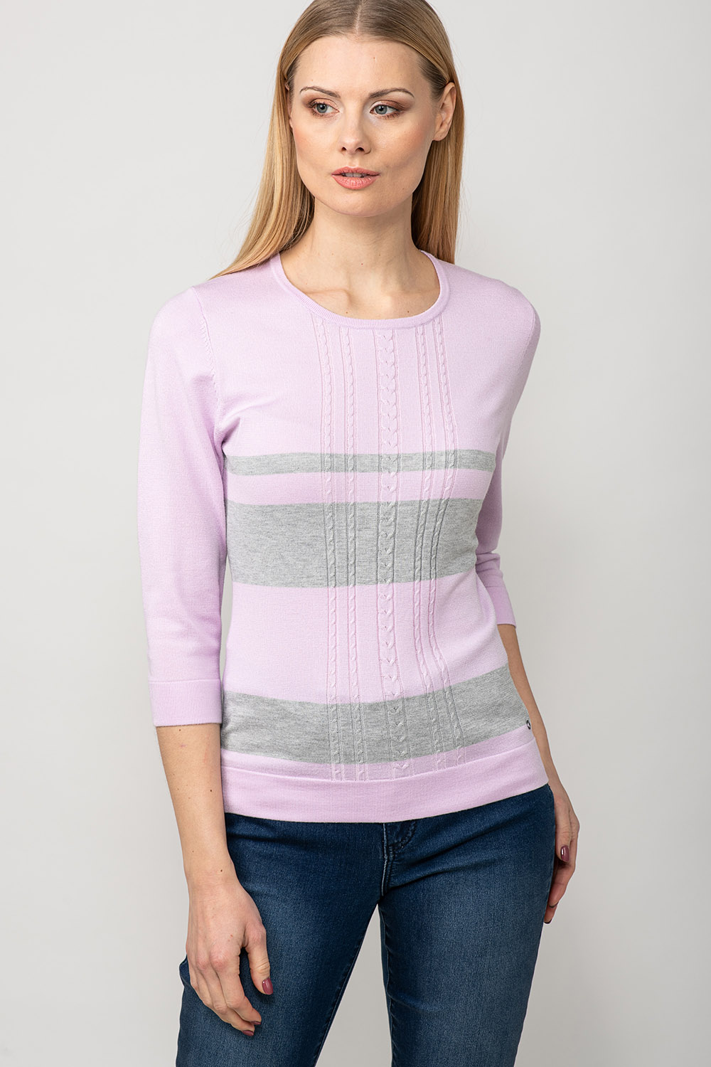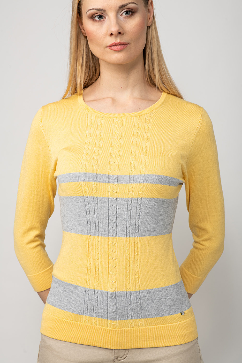 Värviline ja mugav! Džempri disainis on kasutatud laiu kontrast-triipe ja palmikustruktuuri toote rinnaosal. Lõnga peamiseks koostisosaks on viskoos, mis teeb toote meeldivalt pehmeks ja nahasõbralikuks.