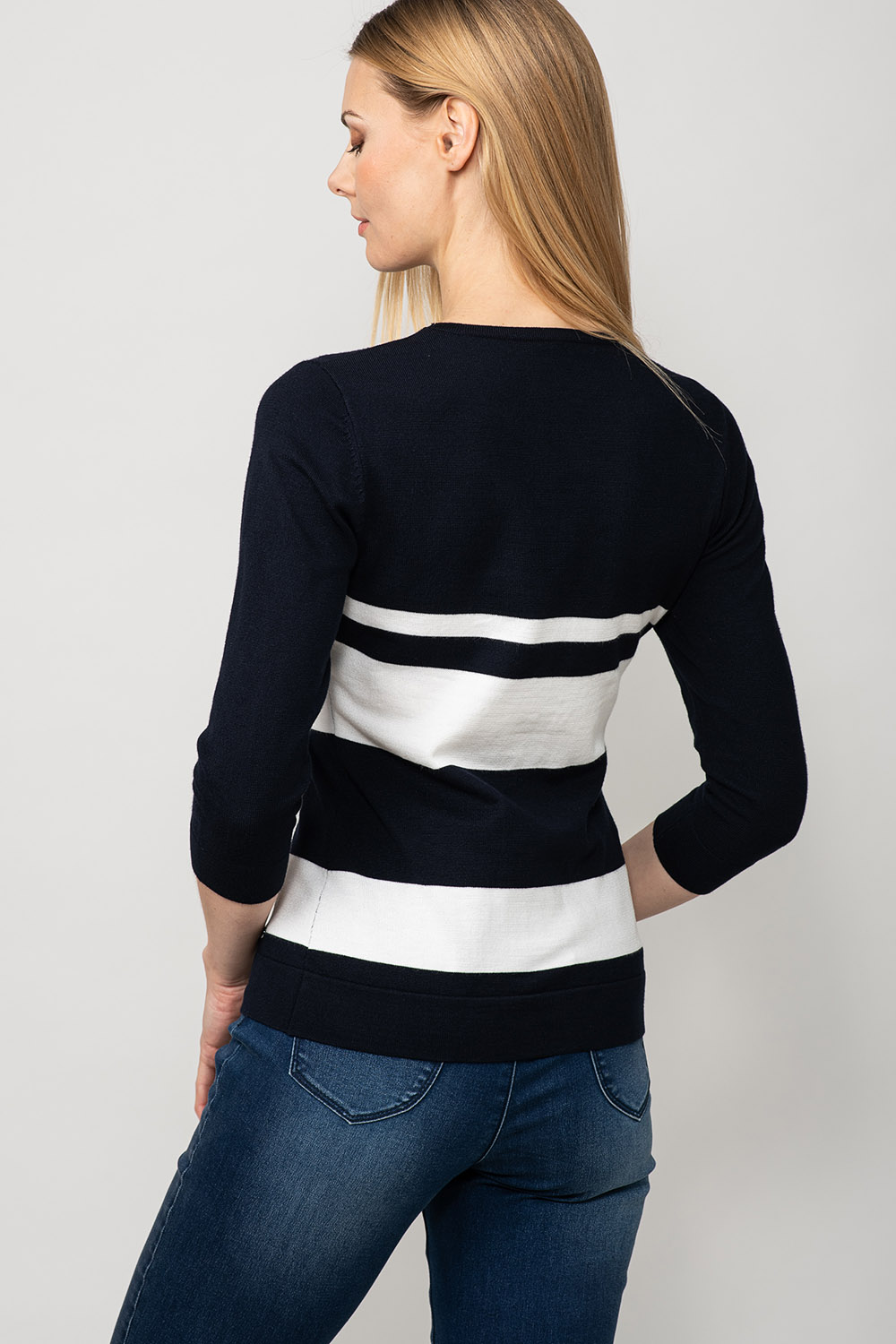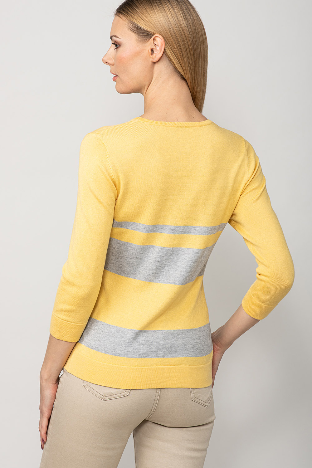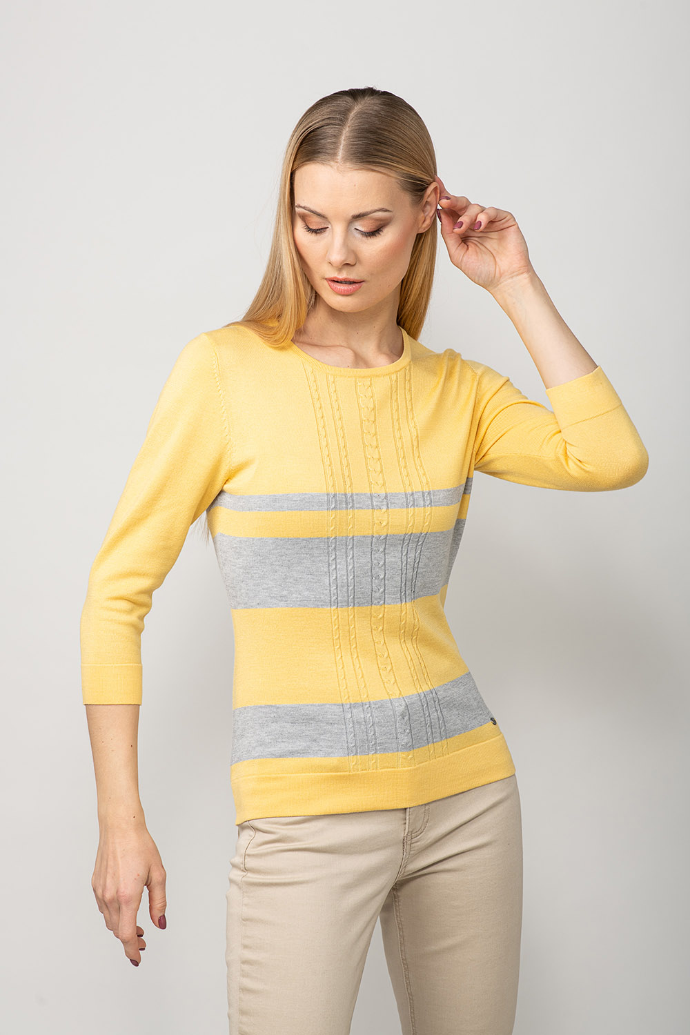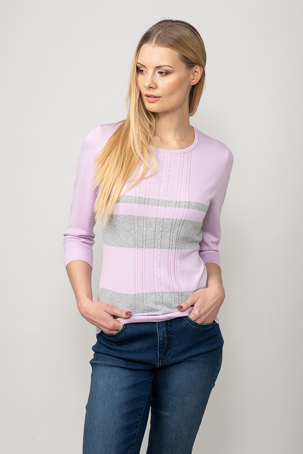 Värviline ja mugav! Džempri disainis on kasutatud laiu kontrast-triipe ja palmikustruktuuri toote rinnaosal. Lõnga peamiseks koostisosaks on viskoos, mis teeb toote meeldivalt pehmeks ja nahasõbralikuks.