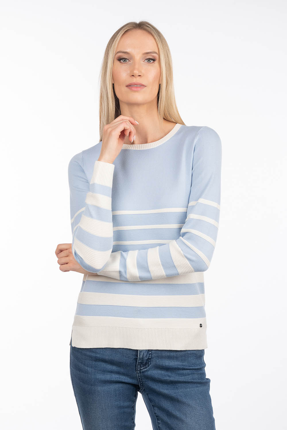 Klassikaline merestiil uues võtmes. Selle helesinise kampsuni struktuurne triibukude lisab lihtsale lõikele isikupära ja sügavust. Valmistatud pehmest viskoosist, pakkudes mugavust ja elegantsi igaks päevaks.