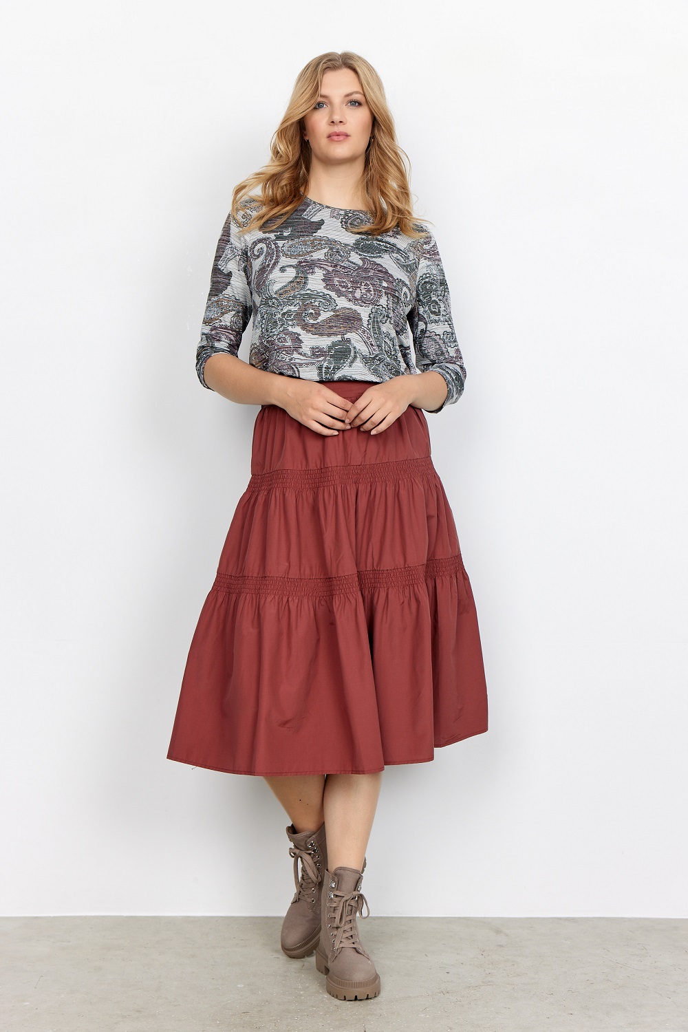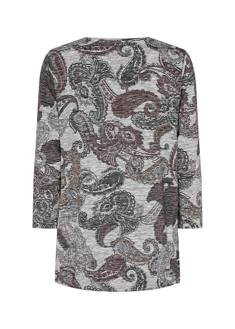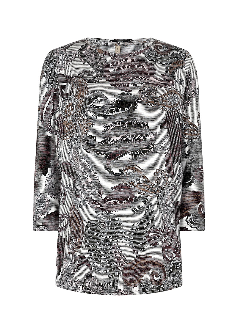 GALINA 21 on viskoosi ja polüestri segu kangast särk. Särgil on ovaalne kaelus, 3/4 pikkusega varrukad ja elegantne mustriline trükk.